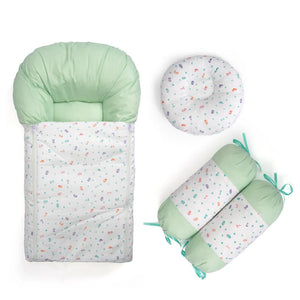Give your baby the ultimate sleeping experience with this 4-piece bed set, consisting of a carry nest, 2 side pillows, and 1 head pillow. Made from soft cotton fabric, this set ensures your baby's comfort and safety.