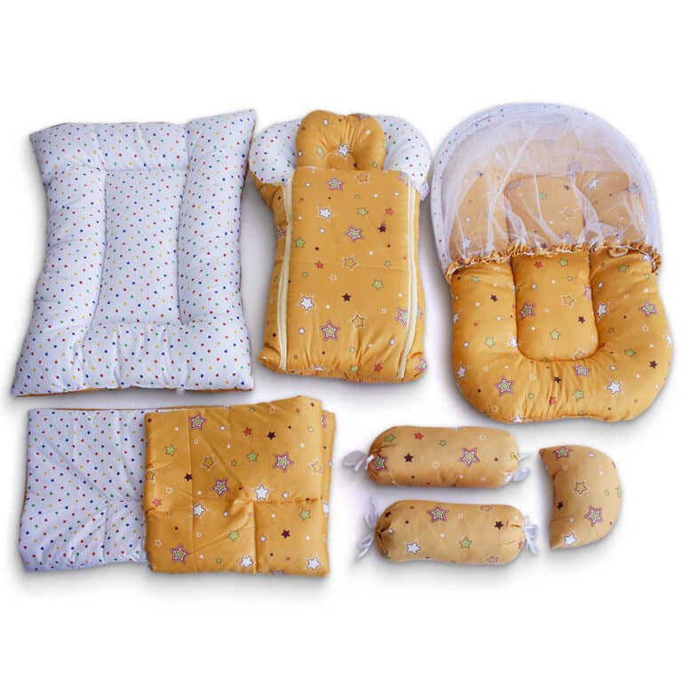 The 8-piece baby bed set is a comprehensive collection of bedding essentials designed to provide comfort and safety for your little one. This set includes a mattress protector, two pillows, two bolsters, a blanket, a comforter, a sheet, and a sleeping bag.