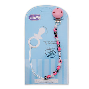 A baby pacifier clip with colorful beads and the word "BABY" is attached to a clothing clip, making it easy to keep the pacifier within reach. The packaging features a warning label cautioning against tying the pacifier around a child's neck. Designed for babies aged 0+ months, this product is both functional and stylish, ensuring safe, fashionable, and fun use.