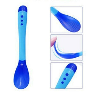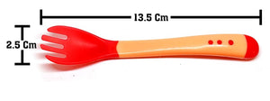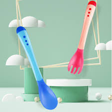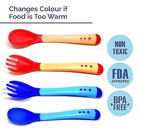 A set of 2 baby utensils, including a spoon and fork made from soft, BPA-free silicone. The spoon features a heat-sensitive color-changing technology that alerts parents when food is too hot for their baby.